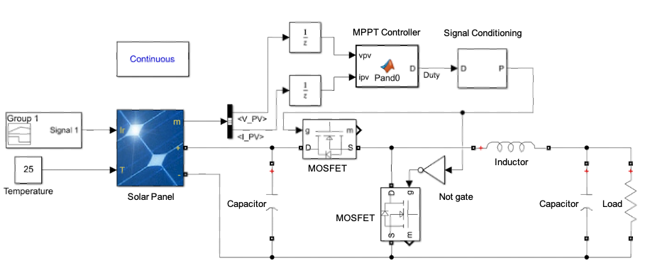 Solar panel Maximum Power Point (MPP) will vary depending on two environmental conditions, the amount of irradiance that illuminates the solar panel and the solar panel working temperature [1]. Due to the variations of those two factors in real-life solar panel operation and in order to maximize the solar panel power output, load characteristics must be continuously adjusted so that the solar panel constantly operates at or near its MPP [2][3].