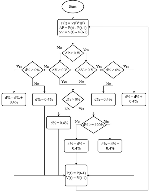 Figure 2 shows that there are two main conditions in the algorithm, an increase or a decrease in duty cycle by 0.4%. Delta duty cycle (d%) is set to 0.4% to increase resolution of the DC-DC converter voltage. A decrease in the duty cycle will happen if the delta power and delta voltage