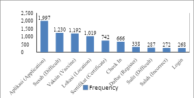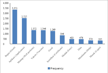 The results of the classification of positive and negative sentiment classes from the Peduli Lindungi application review data will be visualized. Visualization aims to extract information that users of the Peduli Lindungi application most often discuss. This review yields essential information. A word association search was conducted at multiple frequencies to strengthen the information obtained. The following is a visualization in the form of a diagram of the frequency of occurrence of words, word clouds, and word associations for the Peduli Lindung application.