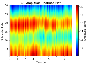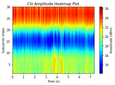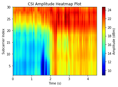 After obtaining the dataset, preprocessing is performed. In this step, a python library called CSIKit is used to extract the CSI data [17]. Then the data is visualized in heatmap format. Three filters are used to preprocess the heatmap: a lowpass filter to isolate frequencies below 10 Hz, a Hampel filter to reduce high frequency noise, and a running mean filter for smoothing. Figure 1 showed three examples of converted heat maps for different activities measured from various distances.