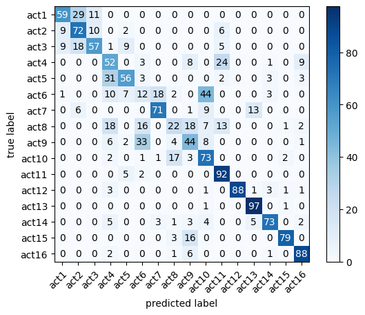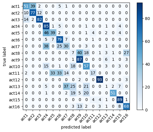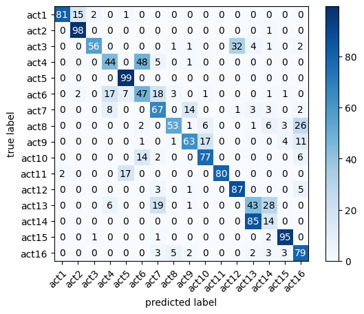 In this section, the prediction results made by deep learning are presented. The confusion matrices show the comparison of actual and predicted of 16 performed activities in percentage. The following image shows the measurement from 1 meter.