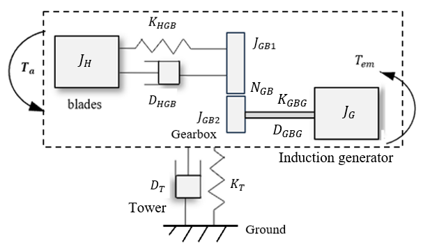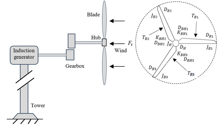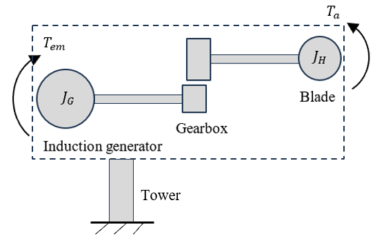denote generator inertia, hub inertia, electro-magnetic torque, and aerodynamic torque, respectively. While Figure 3 depicts mechanical diagram of wind turbine with blade, gearbox, and induction generator. All parameters are described in Table 1.