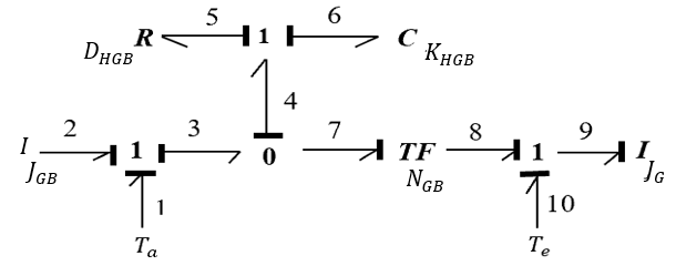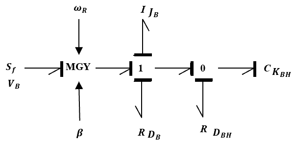 The rotating inertia displays a derivative causality as rotational speed is identified with bond 1. Factually, blades generate the torque as output; its necessities the rotational speed as input. Moreover, bond 1 necessitaes a connection alongside the hub. The reduced Bond graph shape of a ductile blade is seen in Figure 5. In Figure 5, the parameters of