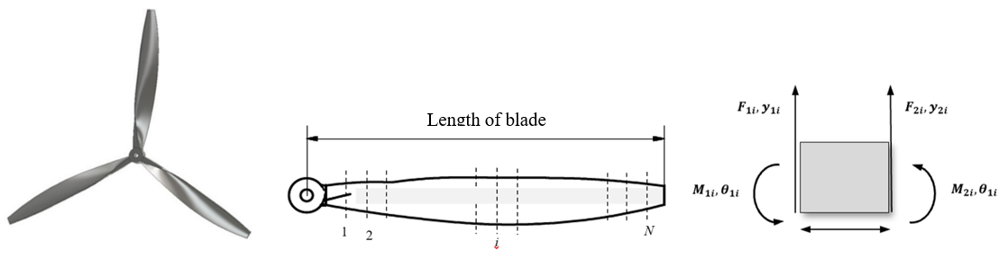 All physical model of the blade is created on Rayleigh beam structure and blade element momentum (BEM) method [24][25]. These methods adapt the blade as stiffness frame dynamics where its sections are basically detached structure frameworks, achieved by partial differential calculation, and are massed in space by finite elements, shown in Figure 4. Every section has own displacement and this movement can be expressed as generalized Newton forces and displacements.