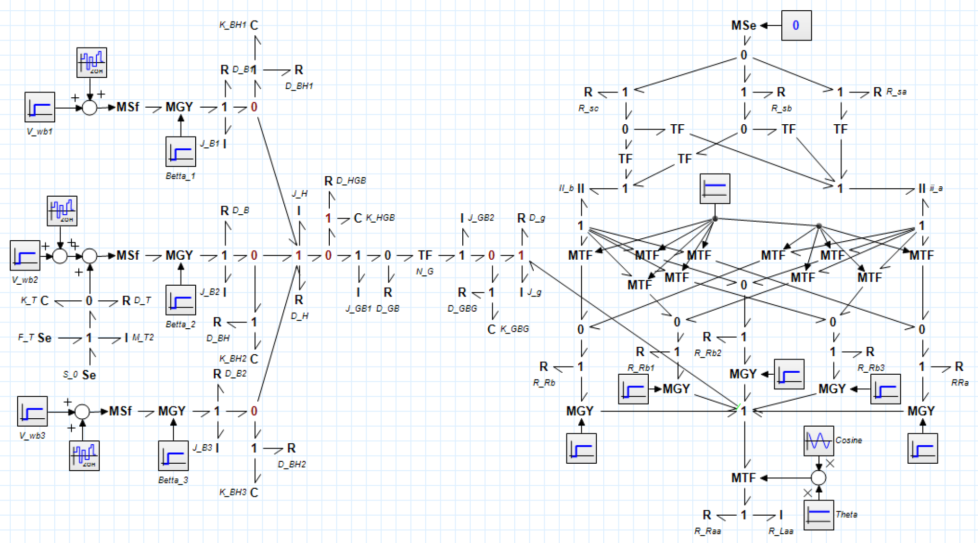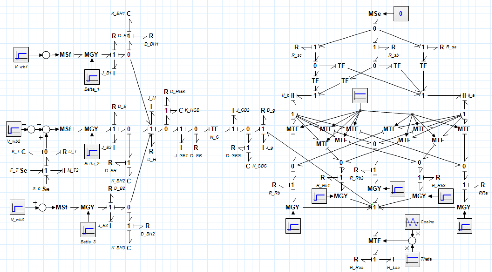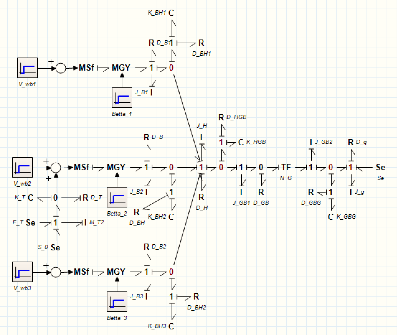 The Bond-Graph model embodying the mechanical system depicted in Figure 1 can be viewed in Figure 9 [26]. Later, the inputs are wind speed containing tower movement on every blade and generator torque. The wind speed is deliver for through a modulated gyrator which transforms flow into effort corresponding to a formula set in within the gyrator. This conversion is dependent on the blades pitch angle, consequently the modulated gyrator. It can be also noted that all the ,