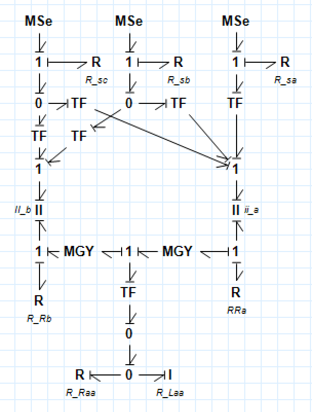 back-over the transformers in front of the phases. The Bond-Graph in Figure 10(b) depictions the interaction both stator coils and rotor bars with 2-port I-elements in the electrical energy area. An inductance only describes storage of magnetic energy. Overlooked are power losses and leakage effects in the magnetic area.