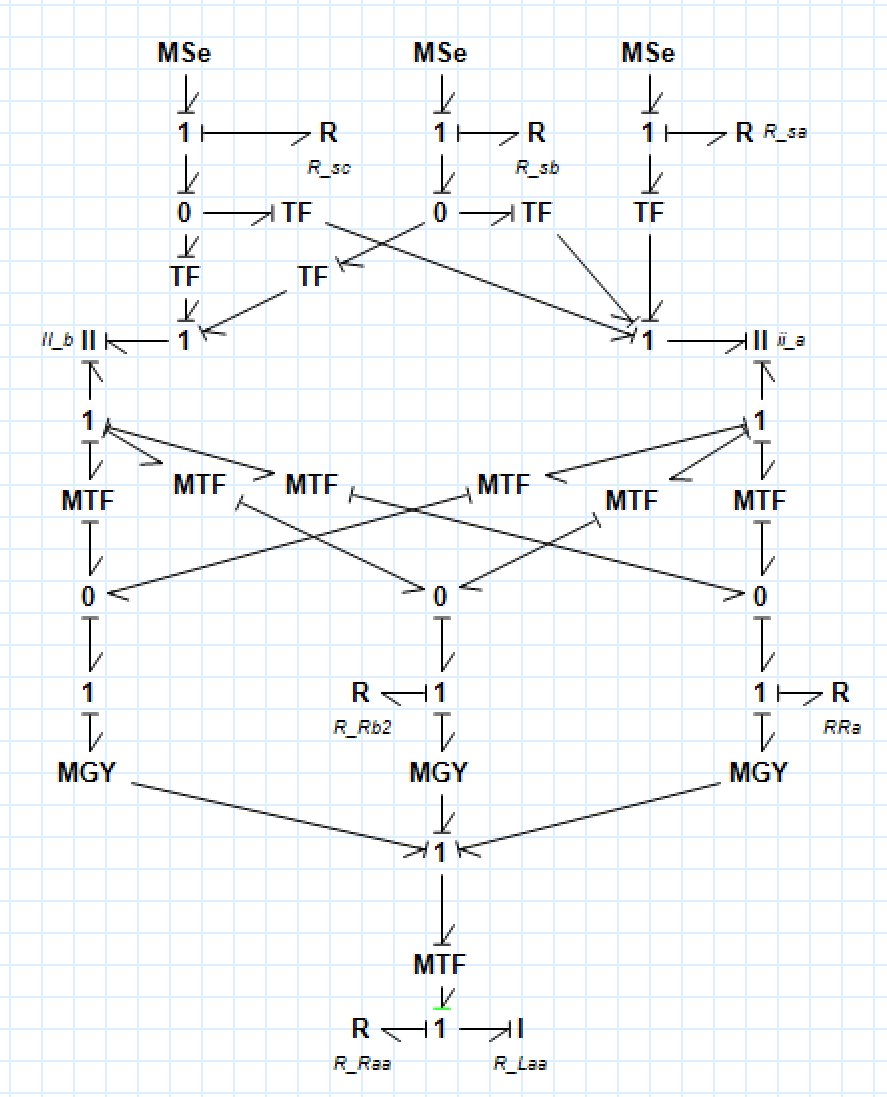 Under this context, for the purpose of analyzing the system in the equal reference frame, the Bond-Graph methodology can embody the whole structure. This methodology offers some correctness that can be functional at once to the model. A Bond-Graph comprises of sub-systems coupled together by power bonds. They exchange instantaneous power at ports. The variables that are forced to be the same, when two ports are linked are the power variables, counted as functions of time. The important gains of the Bond-Graph tool for modeling purposes are a unified graphical language aims to depict with physical perception power interactions, energy dissipation and storage phenomena in dynamic systems of each physical domain and also the visualization instrument of causality properties for writing equations equivalent to chosen modeling guesses. More information can be found in [11].