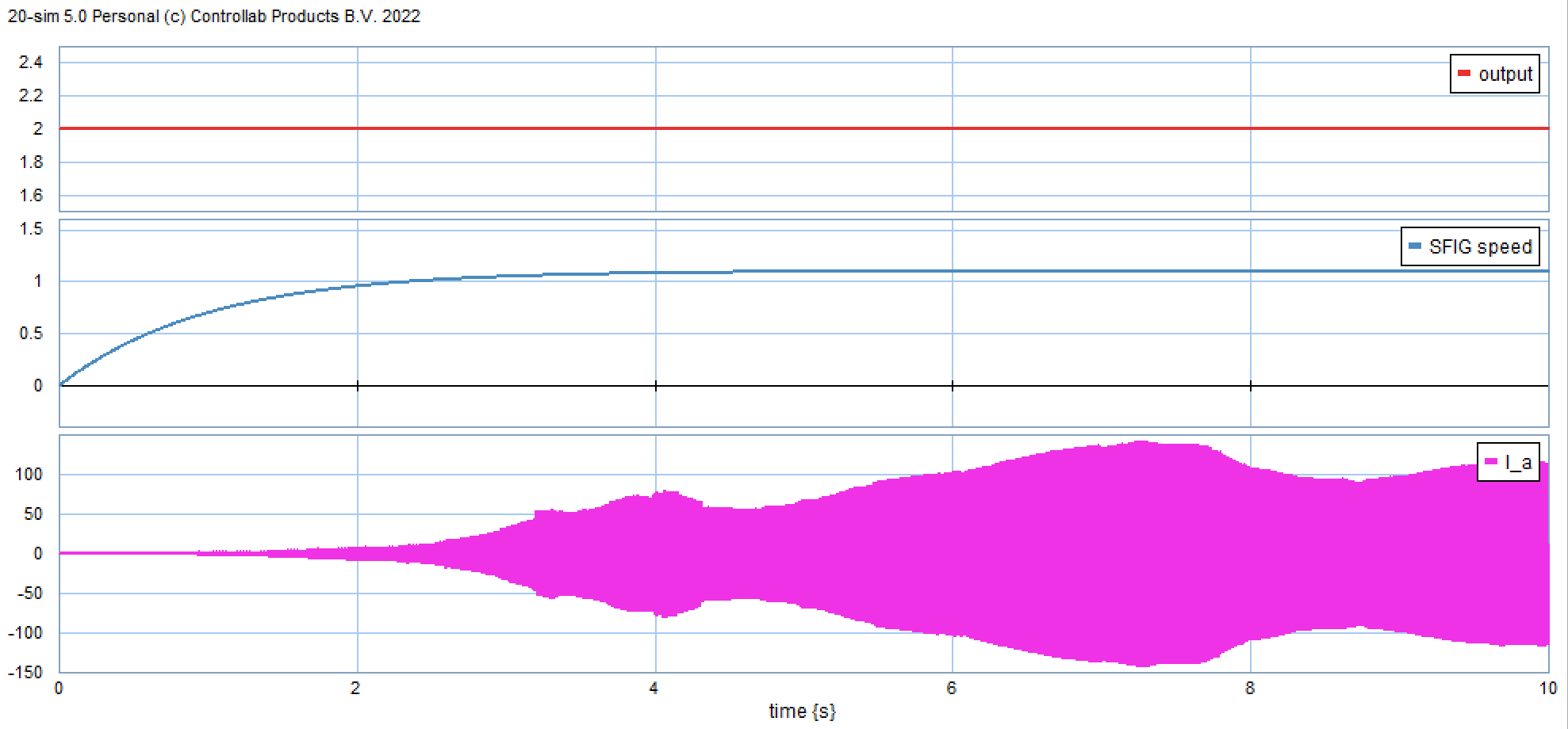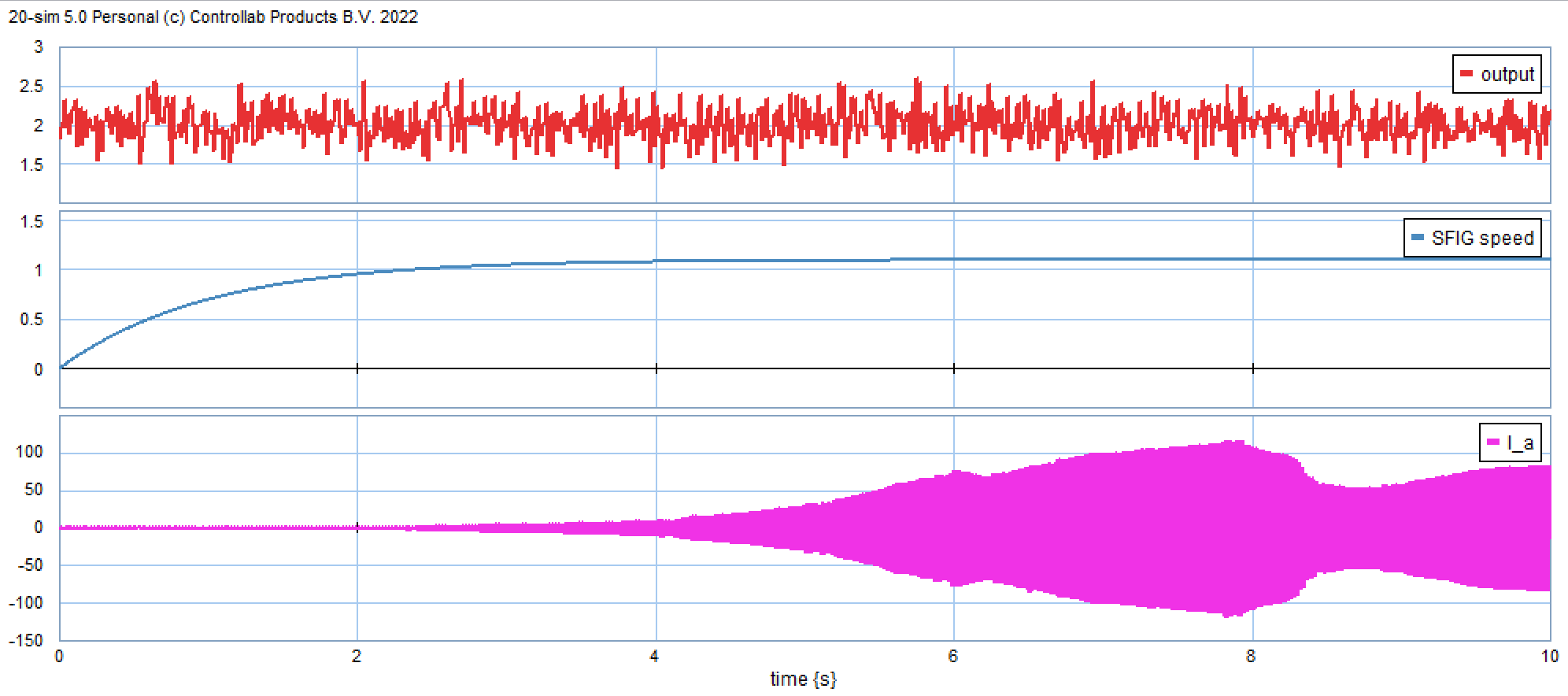 In contrast to a constant wind input, current response of singly-fed induction generator reflects their variability with wind, from 56 to 138 p.u. during a constant wind speed, such as 2 m/s. When the wind speed conditions vary increasing from 1.5 m/s to 2.5 m/s then the current response varies from 60.091 to 104.796 p.u. On the contrary, whether under constant (namely 2 m/s) or varying wind speed (from 1.5 m/s to 2.5 m/s) conditions, the response of generator speed and generator stator current tends to vary; the steady state nominal speed of generator is at 6.04 seconds and the stator current varies at ambient around 134.5 p.u.