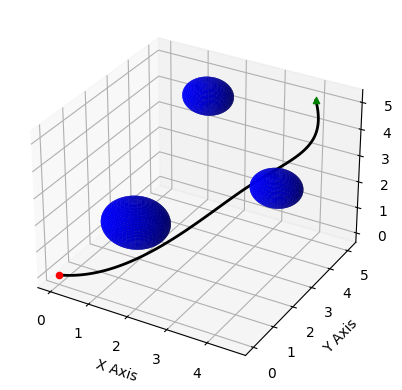 The experiment employs Python, a versatile language for scientific computing, and capitalizes on libraries like NumPy for complex numerical calculations and Matplotlib for visualization, to create a robust simulation environment for UAV path planning. Set within a three-dimensional cubic grid, the simulation space spans 6x6x20 units, offering a realistic representation of a UAV's operational terrain. Central to this environment is the UAV, abstracted as a point object for simplicity, tasked to navigate from an origin point (0, 0, 0) to a target location (4, 5, 5). This seemingly straightforward trajectory is complicated by the presence of three spherical obstacles, varying in size and strategically placed to challenge the UAV's pathfinding abilities. These obstacles, simulating potential real-world barriers like buildings or natural formations, are pivotal in assessing the algorithm's capability to navigate complex environments.