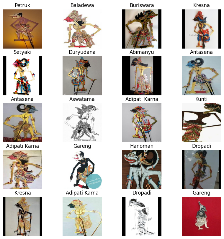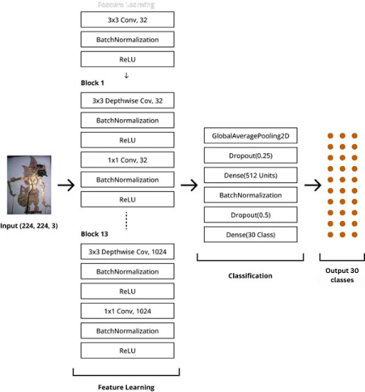 Preprocessing is used to prepare the data before training. Preprocessing steps such as resizing with padding, dataset splitting, data augmentation, and standardization of input are performed. Resizing with padding is useful to keep the aspect ratio of wayang. The dataset is divided into training and test data with a ratio of 4:1. The training data is split to generate validation data for training. Data augmentation will enrich the data because wayang images may be captured from different angles, lighting conditions, and distances. Standardization of input data is also important in deep learning models [15]. The final preparation is to create batches of images from the dataset.