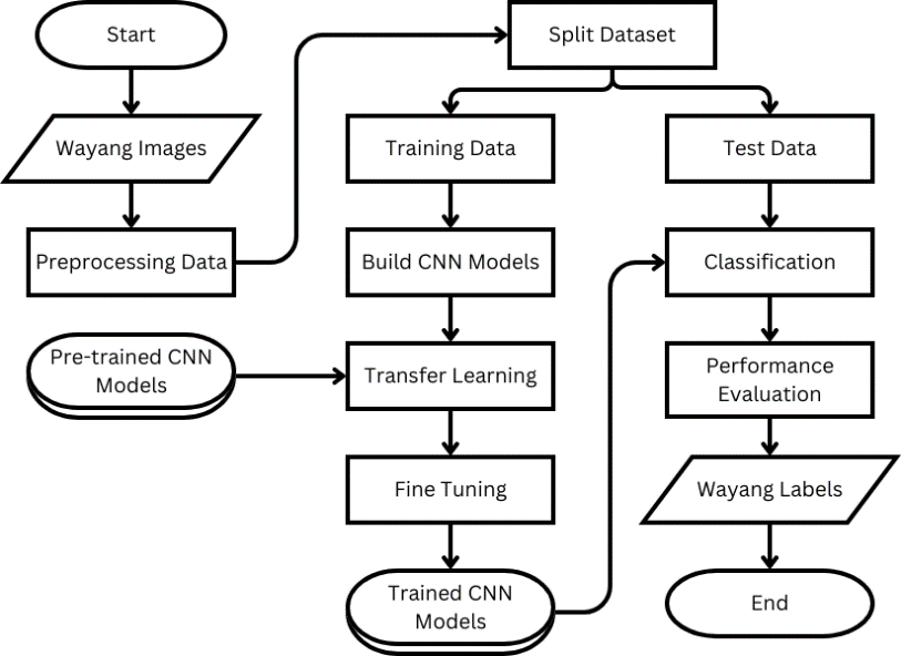 A flowchart of the proposed wayang classification using transfer learning of CNN models is shown in Figure 1. The method consists of data collection, preprocessing, building the model, transfer learning from the pre-trained CNN models, fine-tuning, and performance evaluation. The details of each step are described in the following sub-section.