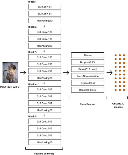 Image classification is used to group images into specific categories. The idea behind image classification is to provide the computer with a series of features extracted from the image, train the features using a model, and return a value indicating the category of the image. This method can also be used to classify wayang from an image [4]–[12]. Nurhikmat uses a Convolutional Neural Network (CNN) model to recognize wayang golek (wooden puppetry) from images to address societal issues of forgetting traditional culture. The performance evaluation shows that the CNN model achieves a training accuracy of 95% and a validation accuracy of 90%, The trained model is tested on new data, achieving an accuracy of 93% [4]. Yudianto et al. apply the CNN model to recognize wayang punakawan from images to address the declining interest in wayang. This research achieves the best accuracy of 97%, precision of 93%, and recall of 87% [5]. Sudiatmika and Dewi use a CNN model namely VGG16 to recognize Balinese wayang from images. The training process is evaluated on several epochs, such as 50, 100, 150, and 200. The best results are achieved in the 200th epoch with an accuracy of 89% [6]. Training a deep learning model requires a large dataset to achieve high performance. With a limited number of wayang datasets, training the model from scratch is not efficient.