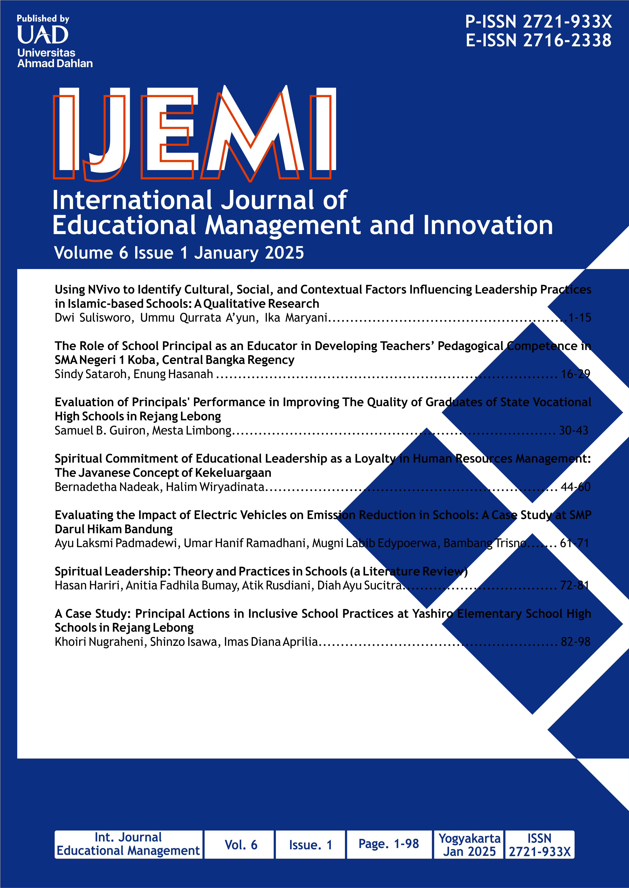 IJEMI International Journal of Educational Management and Innovation Volume 6 Issue 1, the Year 2025, has been available online since January 4, 2025. All articles in this issue consist of 7 original research articles that were authored/co-authored by 20 authors from 5 institutions (Hyogo University of Teacher Education, Universitas Ahmad Dahlan, Universitas Kristen Indonesia, Universitas Pendidikan Indoensia, Universitas Lampung)