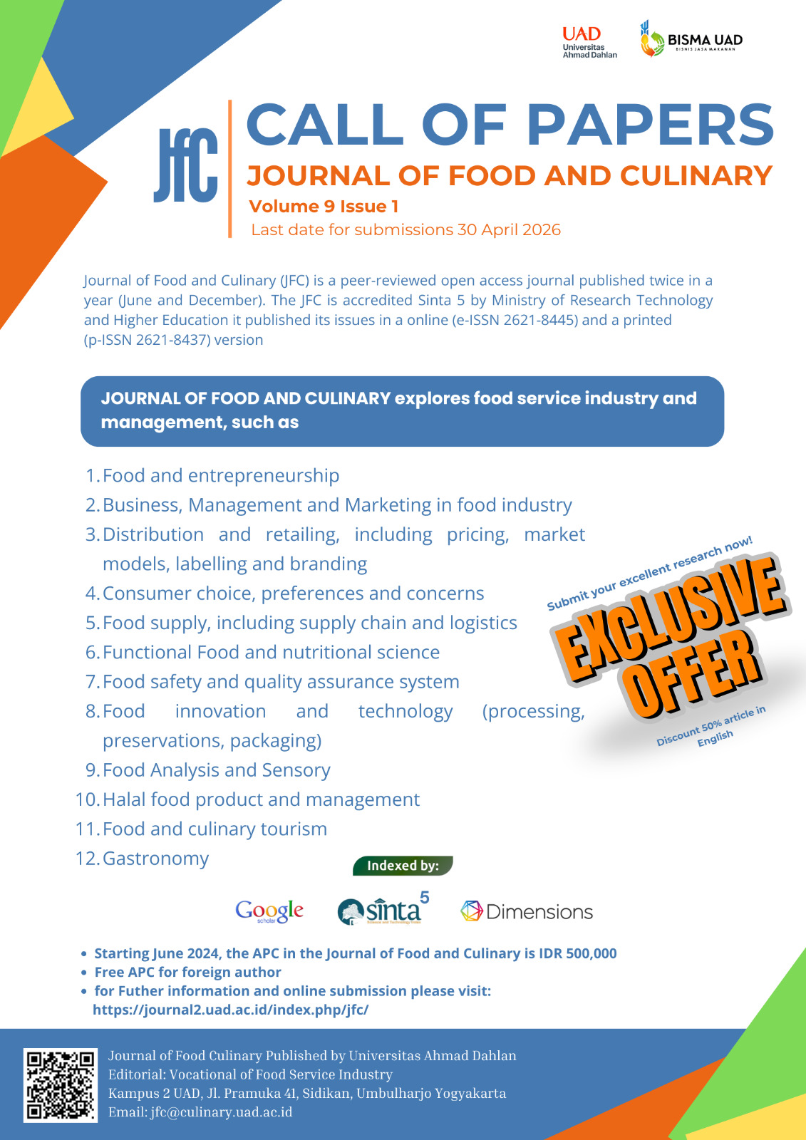 Journal of Food and Culinary (JFC), with registered number ISSN 2621-8437 (print) and E-ISSN 2621-8445 (online), is a scientific journal published by Vocational of Food Services Industry, Universitas Ahmad Dahlan. In addition, JFC is accredited Sinta 5 by Ministry of Research, Technology and Higher Education.