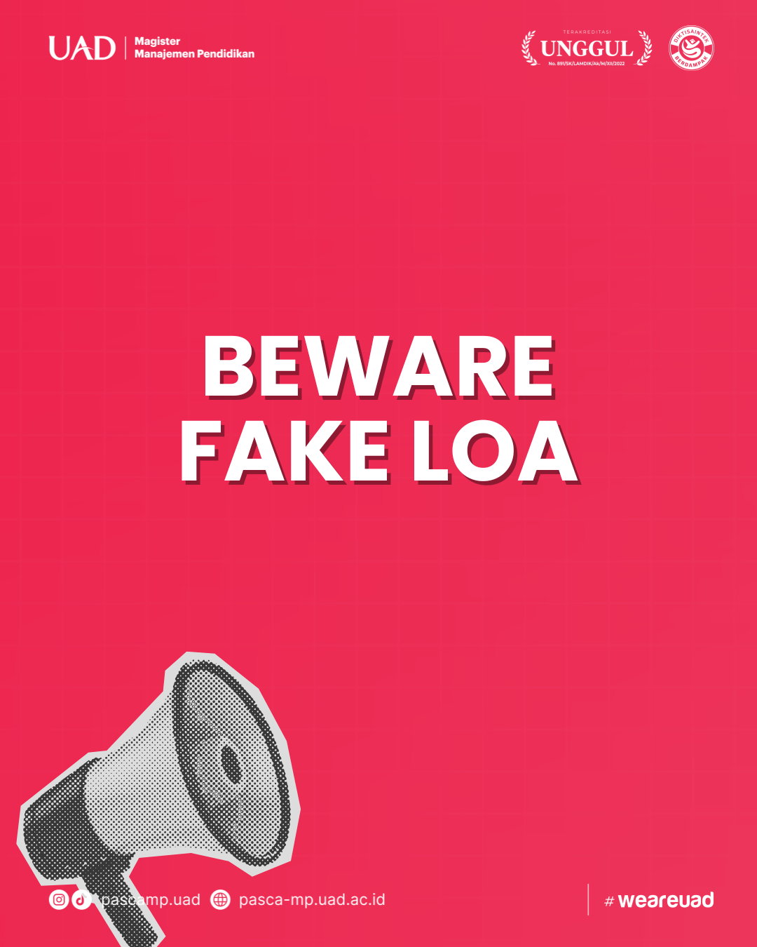 We, the Jurnal Inovasi dan Manajemen Pendidikan (JIMP) editorial team, declare that we have never issued an LoA or charged a publication fee before the article is truly accepted through OJS and email notification (jimp@mp.uad.ac.id / jimp.uad@gmail.com). In addition, we do not create LoAs on behalf of foundations and use QR Code digital signatures. If anyone promises to create an LoA before the entire process at the JIMP is complete, then the LoA can be confirmed as FAKE