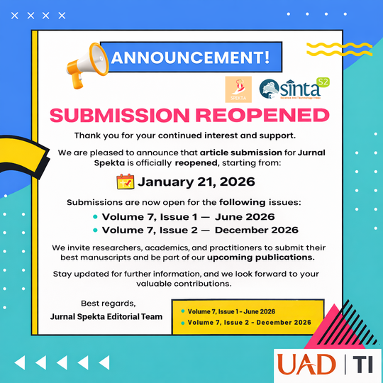 Journal Spekta hereby announces that article submissions have reopened starting January 21, 2026. We invite researchers, students, and practitioners to submit their best articles that align with the journal's focus and scope. We hope that researchers, academics, and practitioners will collaborate across institutions and countries, thereby further enhancing the quality of our articles and addressing relevant global issues.